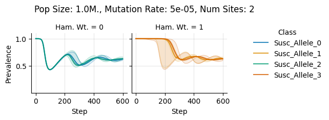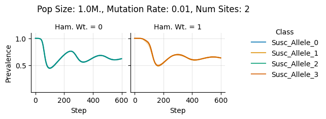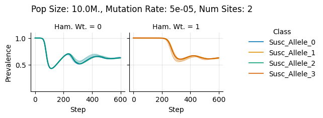 teeplots/col=ham-wt+hue=class+kind=line+mutation_rate=5e-05+n_sites=2+pop_size=1000000+viz=relplot+what=Strain+x=step+y=prevalence+ext=.pdf