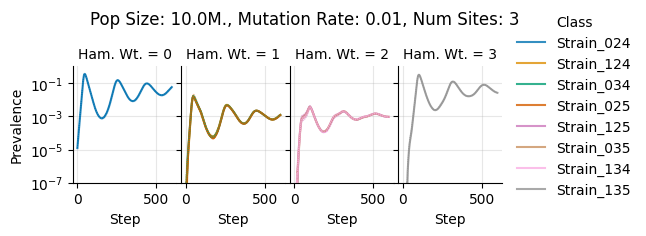 teeplots/col=ham-wt+hue=class+kind=line+mutation_rate=0.01+n_sites=3+pop_size=10000000+viz=relplot+what=Strain+x=step+y=prevalence+ext=.pdf