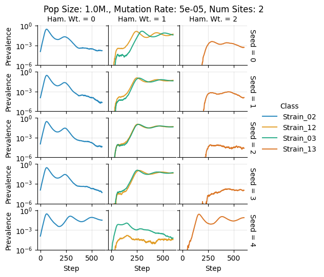 teeplots/col=ham-wt+hue=class+kind=line+mutation_rate=5e-05+n_sites=2+pop_size=1000000+row=seed+viz=relplot+what=Strain+x=step+y=prevalence+ext=.pdf
