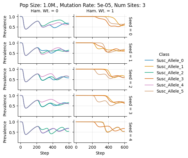 teeplots/col=ham-wt+hue=class+kind=line+mutation_rate=5e-05+n_sites=3+pop_size=1000000+row=seed+viz=relplot+what=Strain+x=step+y=prevalence+ext=.pdf