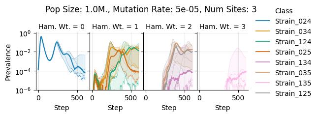 teeplots/col=ham-wt+hue=class+kind=line+mutation_rate=5e-05+n_sites=3+pop_size=1000000+viz=relplot+what=Strain+x=step+y=prevalence+ext=.png