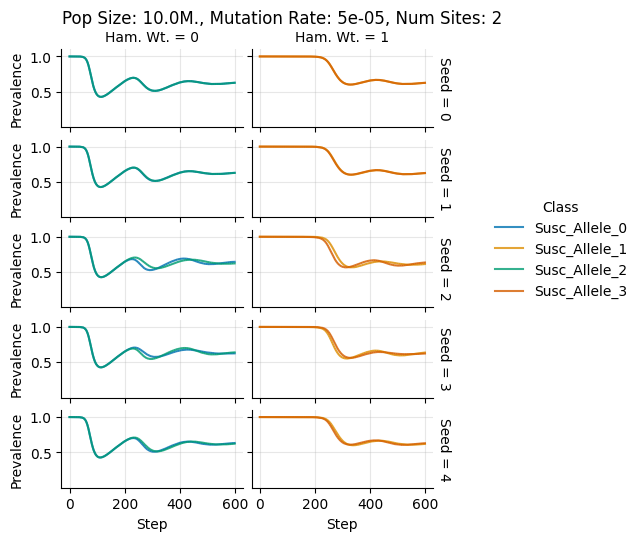 teeplots/col=ham-wt+hue=class+kind=line+mutation_rate=5e-05+n_sites=2+pop_size=10000000+row=seed+viz=relplot+what=Susc+x=step+y=prevalence+ext=.pdf