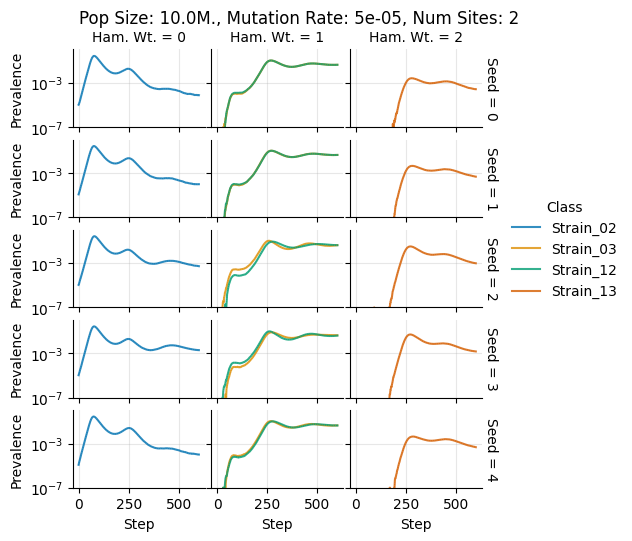 teeplots/col=ham-wt+hue=class+kind=line+mutation_rate=5e-05+n_sites=2+pop_size=10000000+row=seed+viz=relplot+what=Strain+x=step+y=prevalence+ext=.pdf