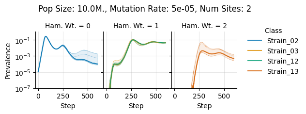 teeplots/col=ham-wt+hue=class+kind=line+mutation_rate=5e-05+n_sites=2+pop_size=10000000+viz=relplot+what=Strain+x=step+y=prevalence+ext=.pdf