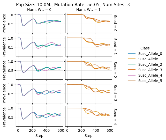 teeplots/col=ham-wt+hue=class+kind=line+mutation_rate=5e-05+n_sites=3+pop_size=10000000+row=seed+viz=relplot+what=Susc+x=step+y=prevalence+ext=.pdf