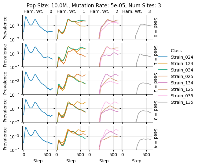 teeplots/col=ham-wt+hue=class+kind=line+mutation_rate=5e-05+n_sites=3+pop_size=10000000+row=seed+viz=relplot+what=Strain+x=step+y=prevalence+ext=.pdf