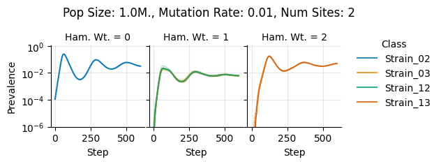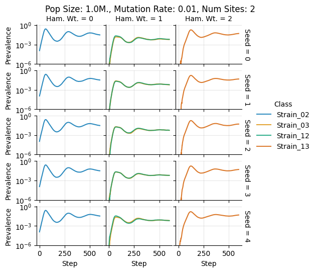 teeplots/col=ham-wt+hue=class+kind=line+mutation_rate=0.01+n_sites=2+pop_size=1000000+row=seed+viz=relplot+what=Strain+x=step+y=prevalence+ext=.pdf