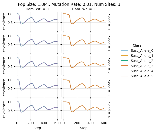 teeplots/col=ham-wt+hue=class+kind=line+mutation_rate=0.01+n_sites=3+pop_size=10000000+row=seed+viz=relplot+what=Susc+x=step+y=prevalence+ext=.pdf