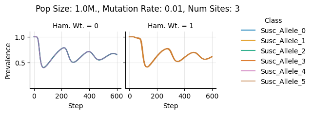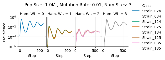 teeplots/col=ham-wt+hue=class+kind=line+mutation_rate=0.01+n_sites=3+pop_size=1000000+viz=relplot+what=Strain+x=step+y=prevalence+ext=.pdf
