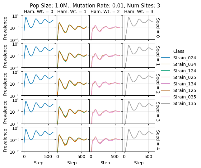 teeplots/col=ham-wt+hue=class+kind=line+mutation_rate=0.01+n_sites=3+pop_size=1000000+row=seed+viz=relplot+what=Strain+x=step+y=prevalence+ext=.pdf