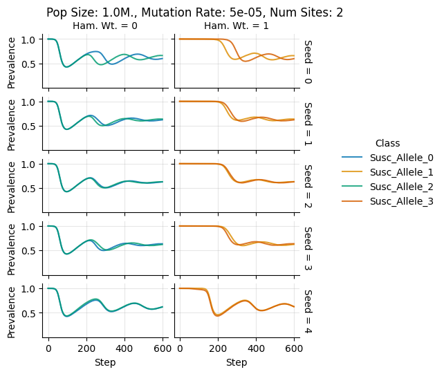 teeplots/col=ham-wt+hue=class+kind=line+mutation_rate=5e-05+n_sites=2+pop_size=1000000+row=seed+viz=relplot+what=Susc+x=step+y=prevalence+ext=.pdf