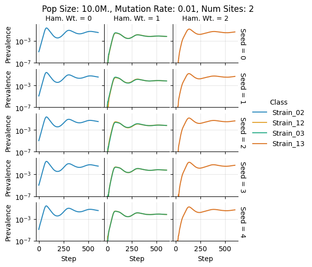 teeplots/col=ham-wt+hue=class+kind=line+mutation_rate=0.01+n_sites=2+pop_size=10000000+row=seed+viz=relplot+what=Strain+x=step+y=prevalence+ext=.pdf