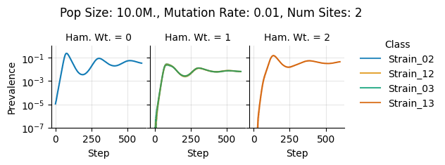 teeplots/col=ham-wt+hue=class+kind=line+mutation_rate=0.01+n_sites=2+pop_size=10000000+viz=relplot+what=Strain+x=step+y=prevalence+ext=.pdf