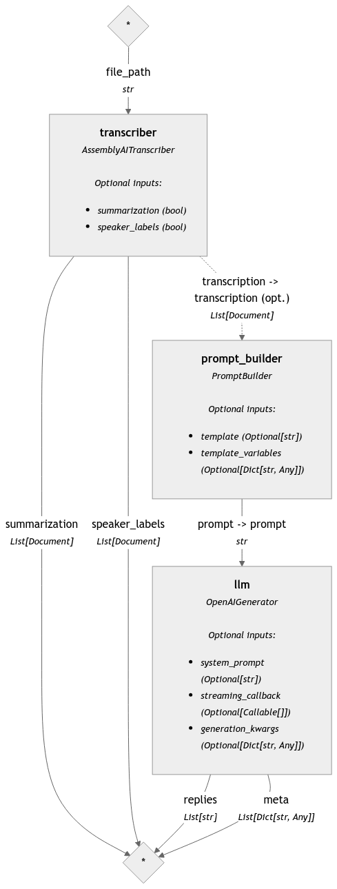 from assemblyai_haystack.transcriber import AssemblyAITranscriberfrom haystack import Pipelinefrom haystack.components.builders import PromptBuilderfrom haystack.components.generators import OpenAIGenerator# Setting up the prompt, the transcriber, and the llm:template ="""Modify the tone of the transcribed story and transform it into Gen Z language.Return only the modified story without a preface.Transcript:{{transcription}}"""prompt_builder = PromptBuilder(template=template)transcriber = AssemblyAITranscriber(api_key=ASSEMBLYAI_API_KEY)llm = OpenAIGenerator(model="gpt-4o")pipe = Pipeline()pipe.add_component("transcriber", transcriber)pipe.add_component("prompt_builder", prompt_builder)pipe.add_component("llm", llm)pipe.connect("transcriber.transcription", "prompt_builder.transcription")pipe.connect("prompt_builder", "llm")